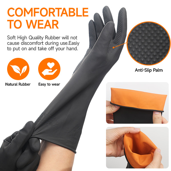 MDOUBLE-LAYER RUBBER FABRIC: Black exterior and orange lining. Usable in temperatures ranging from 0~50°C (32~122°F), these cleaning gloves provide excellent protection for your hands against hot water, detergents, or chemicals, and won't leave any odors on your hands.